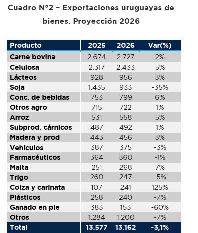 Para 2026, Uruguay XXI proyecta una caída de las exportaciones de bienes de 3,1%, totalizando unos US$ 13.162 millones, en un contexto de menor dinamismo externo y menor desempeño del sector agrícola, una gradual normalización de las condiciones monetarias y la ausencia de shocks disruptivos relevantes, si bien persistían riesgos asociados a tensiones geopolíticas, fragmentación comercial y niveles elevados de endeudamiento.