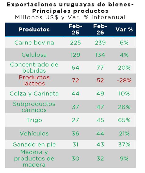 La carne bovina fue el principal producto del mes, con ventas por US$ 239 millones (+6% interanual). En segundo lugar se ubicó la celulosa con US$ 134 millones (+4%) y el concentrado de bebidas ocupó el tercer lugar con US$ 77 millones (+20%).