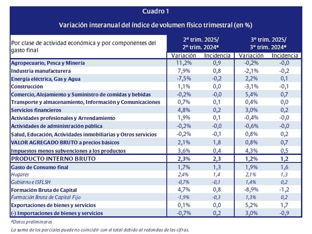 El PIB de Uruguay creció 1,2% interanual en julio-setiembre, pero la actividad cayó 0,2% frente al segundo trimestre en términos desestacionalizados. Analistas advierten por una pérdida de dinamismo en la segunda mitad del año, aunque no se anticipa una recesión técnica.