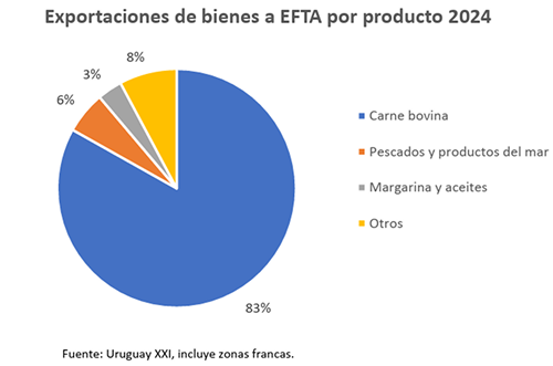 Las exportaciones a EFTA en 2024 estuvieron conformadas principalmente por carne bovina, que representó el 83,2% del total; en segundo lugar, se exportaron pescados y productos de mar, que explicaron el 5,7%; seguidos por margarina y aceites, con el 3,4%. El resto de las exportaciones incluyeron arroz, carne ovina, frutas, vino, lana, madera y miel, entre otros.