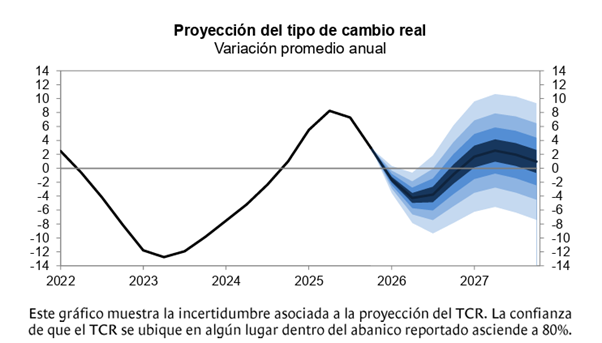 La senda proyectada de TCRE corrige inicialmente a la baja respecto a la presentada en el informe anterior, ante un menor punto de partida y un dólar más depreciado, y luego se mantiene en un nivel similar al esperado previamente. Asimismo, el TCR de fundamentos (TCRf ) corrige a la baja, especialmente en 2026, impulsado por mayores términos de intercambio . Como resultado de la trayectoria de ambas variables, la brecha de TCR (promedio de 3 metodologías) corrige la mitad del desvío en el horizonte de proyección.