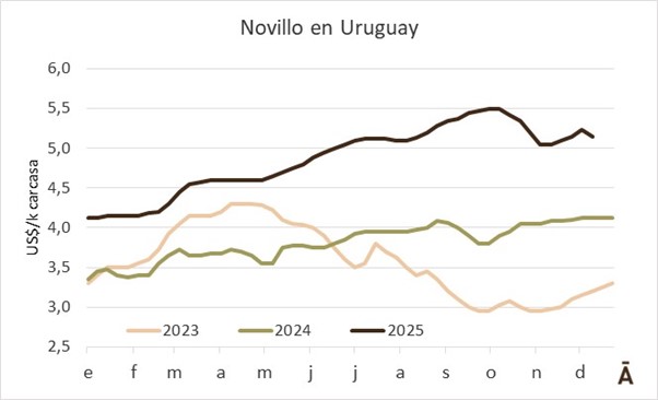 Hoy las referencias van en un rango de US$ 4,90-5,10 por kg carcasa para los novillos, aunque quienes buscan bajar los precios trabajan entre US$ 4,90-5,00, con operaciones muy puntuales y varios negocios trancados desde fines de la semana pasada.