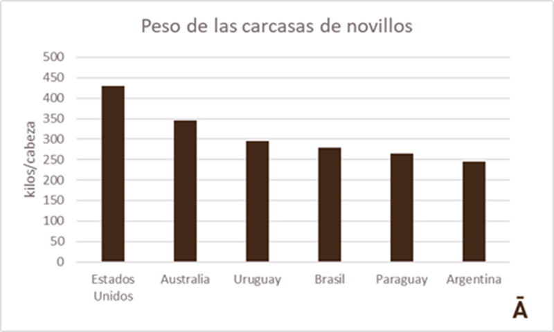 Uruguay tiene mucho camino todavía para crecer, como lo demuestran los pesos medios alcanzados en ganaderías desarrolladas. Estados Unidos juega en otra liga (con el uso generalizada de hormonas y promotores del crecimiento), con pesos de carcasa de novillo que usualmente llegan a 430-435 kilos. Australia tiene una posición intermedia con unos 345 kilos. Uruguay lidera en la región, con unos 295 kilos en enero, por encima de los kilajes de 280 kilos en Brasil y de 260-265 en Argentina y Paraguay.