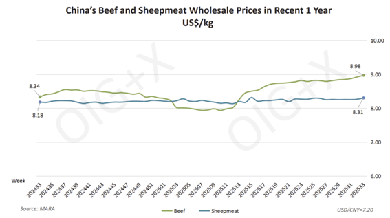 El precio mayorista de la carne vacuna en China mantiene una senda ascendente desde principios de abril. De acuerdo con datos de MARA dados a conocer por OIG+X, el valor medio de la carne vacuna en el mercado mayorista en la semana al 16 de agosto alcanzó prácticamente los US$ 9 por kilo, un aumento de US$ 1 (12,5%) desde principios de abril, cuando cotizaba en el entorno de US$ 8 el kilo.