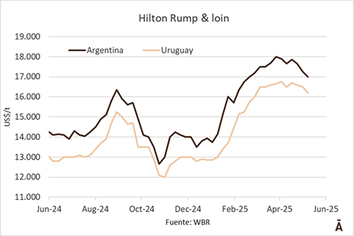 Fue otra semana de afloje para los cortes del rump & loin Hilton en Europa. Fuentes del mercado de importación manejaron negocios a World Beef Report (WBR) desde Argentina en la última semana en un rango de US$/t 16.800 a US$/t 17.300 FOB. En tanto, desde Argentina hubo operadores que manejaron negocios sobre un eje de US$/t 17.000, pero otros ya hablaban de un rango más amplio, con un piso de US$/t 16.500. En tanto, para los cortes de la rueda Hilton, fuentes manejaron valores de US$/t 7.200 FOB. En tanto, otras fuentes del mercado argentino reportaron negocios por bife ancho a US$/t 21.000, bife angosto a US$/t 15.000, y lomos sin cordón a US$/t 28.000 FOB. En el caso de Uruguay, un importador manejó negocios a US$/t 16.200 FOB la pasada semana para el Hilton.
