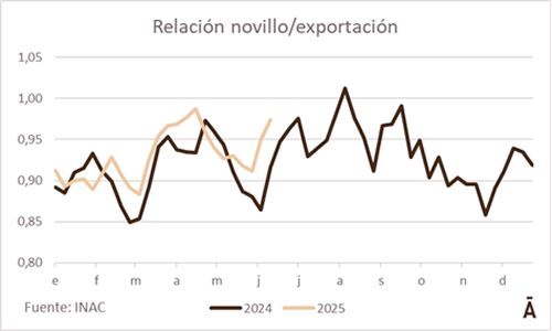 El cociente que informa semanalmente el INAC entre el precio de compra de vacunos por parte de la industria frigorífica y el valor medio de exportación de la carne vacuna sugiere una ecuación más estrecha para la industria frigorífica en lo que va de este año respecto al anterior.