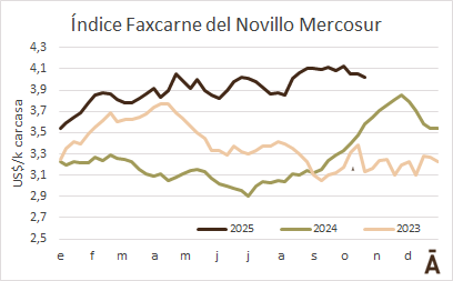 El Índice Faxcarne del Novillo Mercosur bajó 3 cents a US$ 4,02 el kilo carcasa y acumula una caída de 11 cents en las últimas tres semanas.