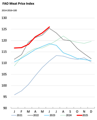 El índice de precios de la carne de la FAO registró un promedio de 126,0 puntos en junio, con un aumento de 2,6 puntos (2,1%) con respecto a mayo y de 7,9 puntos (6,7%) con respecto a su valor del año anterior, marcando un récord. Esta suba se debió al aumento de los precios en todas las categorías de carne, excepto la de aves.