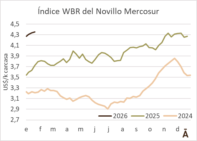 El valor medio del ganado a faena en la región subió por cuarta semana consecutiva. El Índice WBR del Novillo Mercosur aumentó 2 cents en la semana a US$ 4,35 el kilo, acumulando una recuperación de 10 cents en las últimas cuatro.