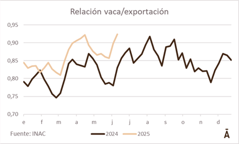 El cociente que informa semanalmente el INAC entre el precio de compra de vacunos por parte de la industria frigorífica y el valor medio de exportación de la carne vacuna sugiere una ecuación más estrecha para la industria frigorífica en lo que va de este año respecto al anterior.