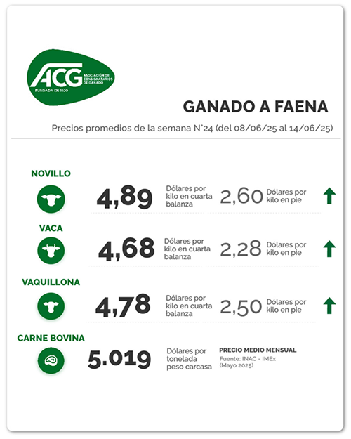 Los valores de la hacienda volvieron a ajustar al alza en la semana cerrada al 13 junio, aunque lo hicieron a un ritmo algo más moderado que siete días atrás. Con una “demadna sostenida” por parte de la industria, la reunión de precios de la ACG de este lunes pautó referencias promedio en su planilla de US$ 4,89 por kg carcasa para el novillo (+6 cents), de US$ 4,68 para la vaca gorda (+8 cents), y de US$ 4,78 para la vaquillona (+8 cents).