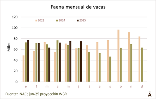 La faena de vacunos en los países del Mercosur en mayo se estima en cerca de 4,1 millones de cabezas, la más abultada desde agosto de 2024. Sin embargo, observando la tendencia anualizada es claro que en los últimos meses la faena ha dejado de crecer y seguramente tome una trayectoria moderadamente descendente a partir del segundo semestre de este año.