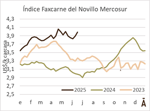 El precio de los animales a faena gozó de un significativo avance esta semana, respaldado por subas de las referencias en Brasil, Argentina y Uruguay y por la debilidad de la moneda estadounidense. El Índice Faxcarne del Novillo Mercosur aumentó 9 cents en la semana a US$ 3,98 el kilo carcasa, el valor más alto en cinco semanas.