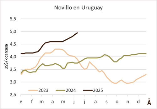 A nivel doméstico, el Banco Central (BCU) dice estar decidido a dar la batalla para que las expectativas de inflación a 24 meses (hoy en 5,5%), converjan a su objetivo de 4,5%. Esa definición lleva a que las autoridades del BCU sostengan una política monetaria contractiva (altas tasas de interés en pesos), algo que tiene sus efectos (negativos) para una apreciación del tipo de cambio. Para que las expectativas de los agentes y las empresas se alineen al 4,5% que persigue el gobierno, serán clave los lineamientos salariales que presentará el Poder Ejecutivo en las próximas semanas para el sector público y privado, así como las previsiones de gasto público del próximo Presupuesto quinquenal que ingresará al Parlamento el próximo 31 de agosto.