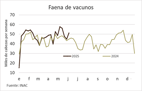 Luego de dos semanas con una actividad por debajo de las 50 mil cabezas por conflictos sindicales y feriados al cierre de mayo, la faena vacuna recobró impulso en la primera semana de junio. De acuerdo con los que divulgó el INAC, en la semana cerrada al 7 de junio se procesaron 51.130 cabezas, un aumento del 13,8% versus siete días atrás (+6.215 cabezas), y muy por encima de los 44.801 animales de igual semana del año pasado (+14%).