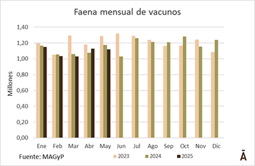 La faena bovina del quinto mes de 2025 alcanzó 1,118 millones de cabezas en Argentina, 1,1% menos que en abril. Si se ajusta la cifra por los 21 días hábiles de mayo, resulta una faena diaria de unos 53.200 animales, con lo que el retroceso intermensual sube a 10,5% en comparación con las 59.500 cabezas diarias faenadas en promedio en los 19 días de abril.