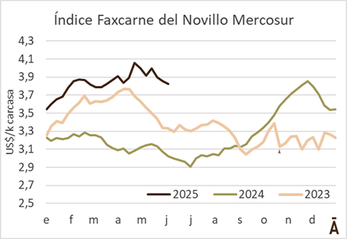 El Índice Faxcarne del Novillo Mercosur moderó su descenso en la última semana y perdió apenas 2 cents para cerrar en US$ 3,83 por kg carcasa. Uno de los cambios relevante que tuvo el mercado regional para la materia prima fue el corte de la tendencia bajista que venía mostrando Brasil.