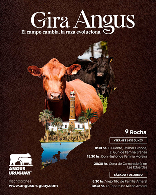 Este viernes 6 y sábado 7 de junio, en Rocha, dará inicio una nueva edición de la Gira Angus, El campo cambia, la raza evoluciona. El punto de partida será el establecimiento El Puente, Palmar Grande, y El Gurí de Familia Branna. En tanto, a las 15.30 será el turno para Don Néstor de Familia Moreira. En la noche habrá una cena de camaradería en Las Eduardas. El sábado 7 de junio la Gira Angus continuará por el establecimiento Viejo Tito de Familia Amaral y La Tapera de Milton Amaral.