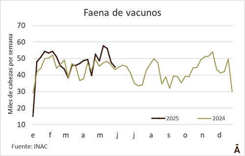 Con un día menos de actividad por el Día del Trabajador Frigorífico, la faena cayó 6% durante la última semana. De acuerdo a la información que divulgó el INAC, en la última semana de mayo se procesaron 44.915 cabezas, casi 3 mil animales menos que siete días atrás. La actividad en novillos sumó 21.576 animales (-1.556), la de vacas 16.396 (-727) y la de vaquillonas 5.898 (-622).