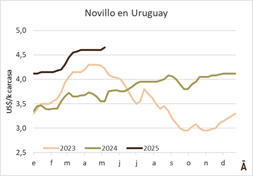 El grueso de la operativa de novillos se hace entre US$ 4,50 y US$ 4,60 el kilo carcasa, al igual que en las semanas previas. Sin embargo, hay mayores posibilidades de alcanzar valores de US$ 4,65 e incluso esporádicamente US$ 4,70 por animales con carcasas de más de 260 kilos. “Los precios son los mismos (que en la semana anterior), pero los lotes destacados pasaron de US$ 4,60 a US$ 4,65”, señaló un operador ayer.