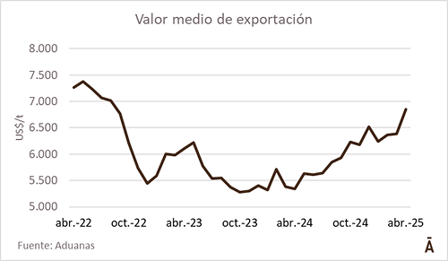 El valor medio de exportación de la carne vacuna fresca tuvo un salto significativo en abril. De acuerdo con datos de solicitudes de exportación informados por Aduanas, Uruguay vendió al exterior 33.062 toneladas de a un valor medio de US$/t 6.850; respecto a marzo, el volumen aumentó en unas 3 mil toneladas, en tanto que el valor medio subió un robusto 7%, casi US$/t 500, alcanzando el nivel más alto desde setiembre de 2022, 32 meses atrás.