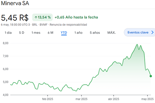 Las acciones de Minerva ya han subido 16% desde el anuncio de la ampliación de capital del pasado 7 de abril. En opinión de los analistas de BTG Pactual, hay margen para subas adicionales. El jueves, los analistas Thiago Duarte, Guilherme Gutilla y Gustavo Fabris, publicaron un informe donde elevan el precio objetivo de la acción a R$ 10 durante los próximos 12 meses, desde el R$ 9 anterior. La acción de Minerva cerró este martes a R$ 5,45, tras perder 6,4% versus el lunes.