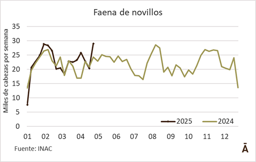 La escasez de novillos y los altos precios del ganado a faena están haciendo crecer la actividad industrial con vaquillonas. En lo que va del año la faena de vacunos creció 3,5% anual, con un moderado aumento en la cantidad de novillos y una disminución, también moderada, de las vacas. Sin embargo, la faena de vaquillonas creció un consistente 18,5% anual en lo que va de 2025 hasta el 19 de abril.