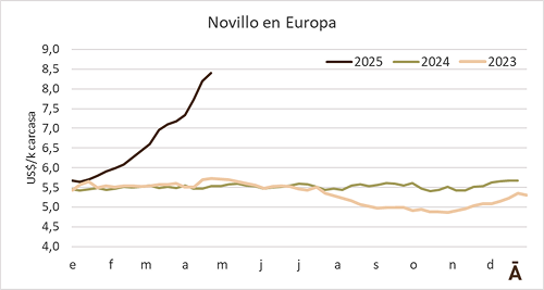 En los últimos meses, los precios de la carne vacuna en toda Europa se han elevado a niveles sin precedentes, impulsados por una confluencia de factores que afectan tanto la oferta como la demanda. En términos de US$, los precios del novillo terminado rozaron los US$ 8,50, tras haber comenzado el año en US$ 5,65, un incremento cercano al 50%. La fortaleza del € también contribuye a esta suba.