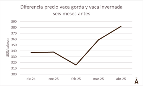 Tomando una invernada de 180 días, los productores en octubre del año pasado reponían sus vacas de invernada en US$ 1,65, pesando 381 kilos, de acuerdo con los valores de los remates por pantalla de ese mes (Pantalla Uruguay, Lote 21 y Plaza Rural).