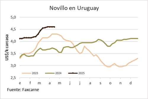 Los novillos especiales de pradera se mantienen sobre una base de US$ 4,60 el kilo. Se da la posibilidad de negocios a US$ 4,65-4,70 el kilo siempre que el lote se encuentre en la mitad sur del país o que no se establezca una fecha de entrada a planta, pudiendo darse el caso de que la carga se termine concretando varias semanas después.
