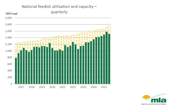 El sector de feedlots en Australia mantuvo su impulso durante el tercer trimestre de 2025, con una capacidad nacional en máximos históricos y una rotación trimestral cercana al millón de cabezas. A pesar de una leve caída en el stock de animales en engorde, la utilización se mantiene elevada, consolidando el rol del feedlot como pilar de la producción de carne vacuna del país.
