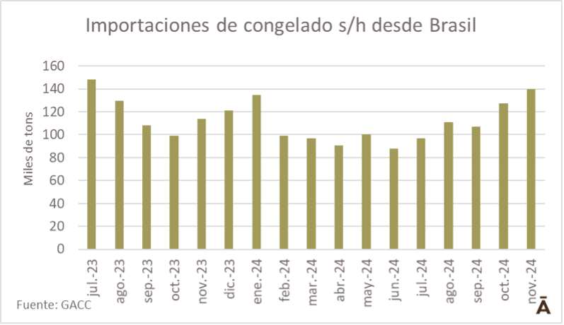 El crecimiento del volumen de carne vacuna importado por China en noviembre se sostuvo fundamentalmente en un incremento del que llegó desde América del Sur, fundamentalmente desde Brasil y Argentina.