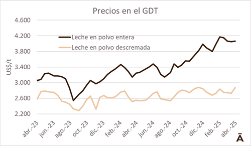 Por otro lado, en el remate de Fonterra del GDT tradicional, el promedio de todos los lácteos subastados subió 1,1% este martes y cortó una racha bajista de tres licitaciones. El promedio general se ubicó en US$/t 4.250 con un volumen comercializado de 17.643 tons, unas 2 mil tons menos que el remate del pasado 18 de marzo.