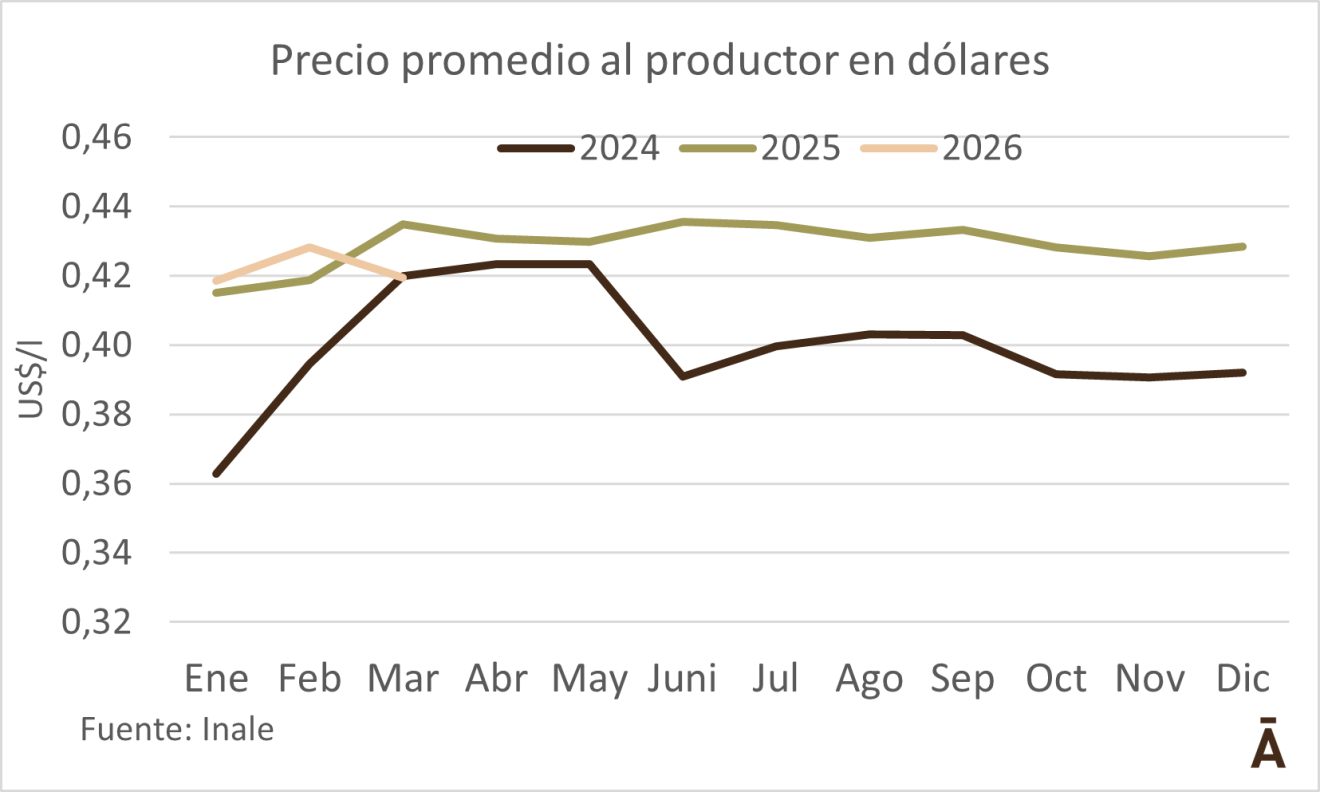 El precio promedio pago por las industrias en marzo tuvo un pequeño aumento en marzo (+2,2% o $ 0,37) medido en pesos corrientes, con un valor de $ 16,88 por litro, según el Inale. Sin embargo, la suba del tipo de cambio el pasado mes llevó a que se perdiera 1 centavo (-2%), con un valor medio de US$ 0,42 por litro.
