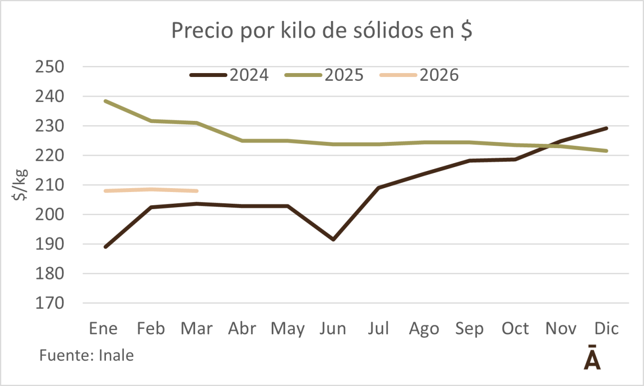 En kg de sólidos, el precio de la leche también bajó, al pasar de $ 280,5 en febrero a $ 208 en marzo.