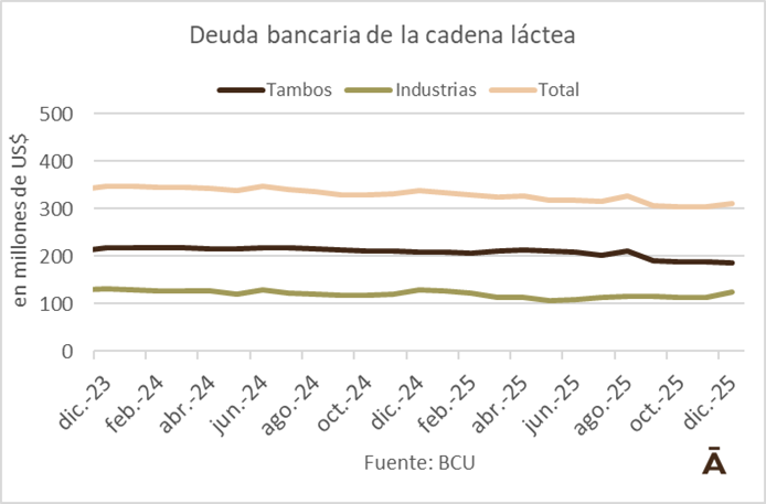 Analizando el conjunto de la cadena (tambos + industrias), el endeudamiento financiero al cierre de 2025 era de US$ 312 millones versus los US$ 338 millones del año anterior.