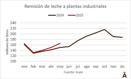 De todas formas, los 166 millones de litros que procesaron las industrias en el quinto mes del año, todavía no llegan a empatar o emparejar los máximos de otros mayos como el de 2023 (170 millones de litros) o 2021 (168 millones de litros).
