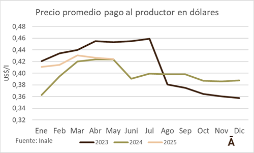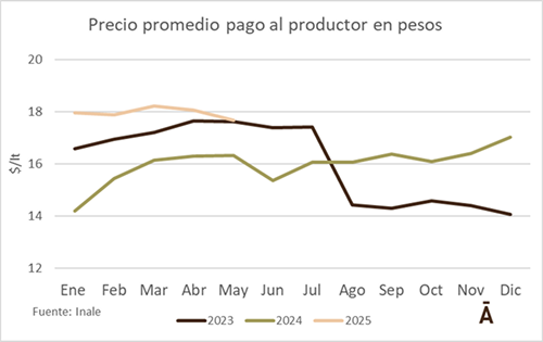 En tanto que en dólares el valor medio bajó 0,6% de US$/lt 0,43 en abril a US$/lt 0,42 en mayo. El tipo de cambio cayó 1,5% en mayo con un promedio mensual de $ 41,68. Dada la tendencia observada en lo que va de junio del dólar (-1,6% en promedio) es más que factible que el precio en dólares se recupere en junio.