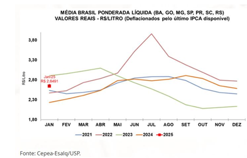 Después de caer durante todo el último trimestre de 2024, el precio de la leche pagada a los productores volvió a subir a principios de 2025. La encuesta Cepea (Centro de Estudios Avanzados en Economía Aplicada), de Esalq/USP, mostró que el precio de la leche cobrado en enero cerró en R$/litro 2,65 (unos US$ 0,46 al tipo de cambio actual) en el “Promedio Brasil”, un aumento del 2,5% en comparación con el mes anterior y del 18,7% en comparación con enero/24, en términos reales (los valores fueron deflactados por el IPCA de enero).