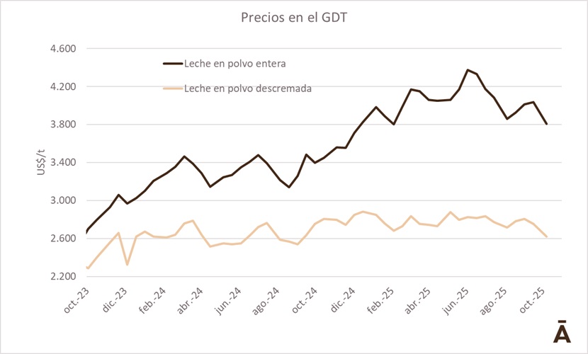 Los precios de los lácteos en el mercado internacional corrigieron a la baja en las últimas semanas. Aunque la referencia promedio de la plataforma de Fonterra, el Global Dairy Trade, se mantiene por encima de los US$ 4.000 por tonelada, un buen valor para la producción, la tendencia fue a la baja en las tres últimas subastas y hay analistas que advierten sobre la posibilidad de un aumento de la oferta en los principales países exportadores que permita un equilibrio con una demanda que se mantiene firme.