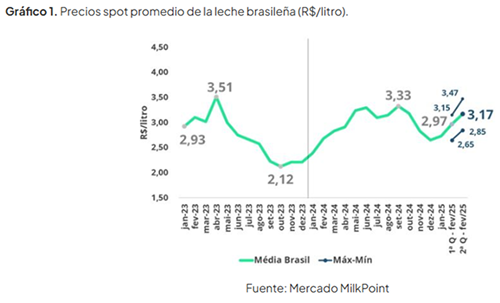 Según datos de MilkPoint Mercado, en la segunda quincena de febrero, la leche spot se valorizó, situándose en R$ 3,17 el litro (US$/lt 0,55), un aumento de R$ 0,20 frente a los valores de la quincena anterior, que se habían situado en R$ 2,97 en el promedio de Brasil.