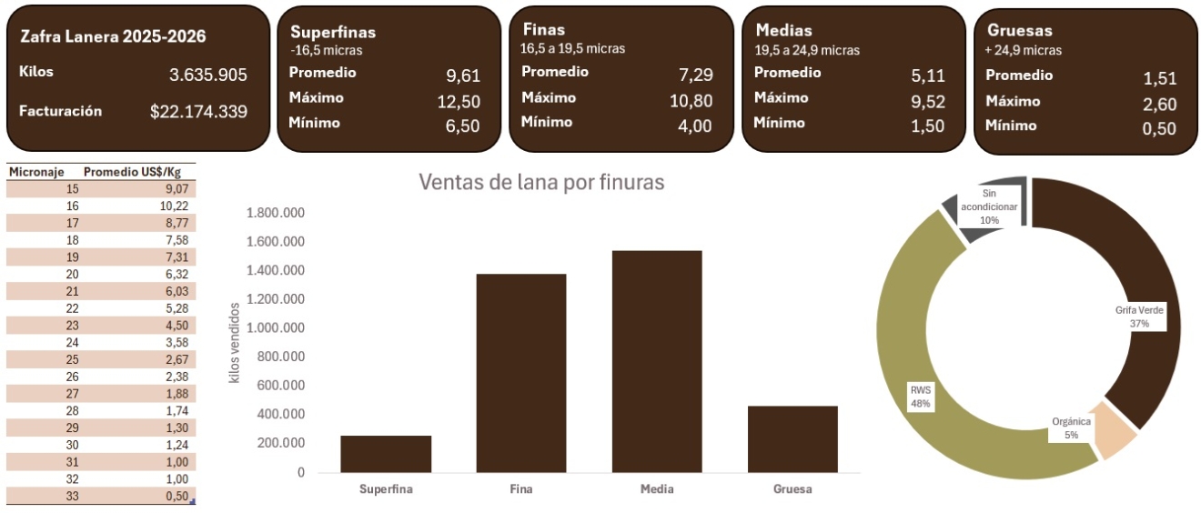 En lo que respecta a los rangos de micronajes, las lanas superfinas (debajo de las 16,5 micras) en esta zafra sumaron 257.633 kilos (7% del total), con un aumento del 245%, debido a que en la zafra anterior se informaron únicamente 74.500 kilos en estos micronajes. El precio promedio fue de US$ 9,61, subiendo 33% entre zafras, y con un máximo alcanzado de US$ 12,50 en el mes de febrero.