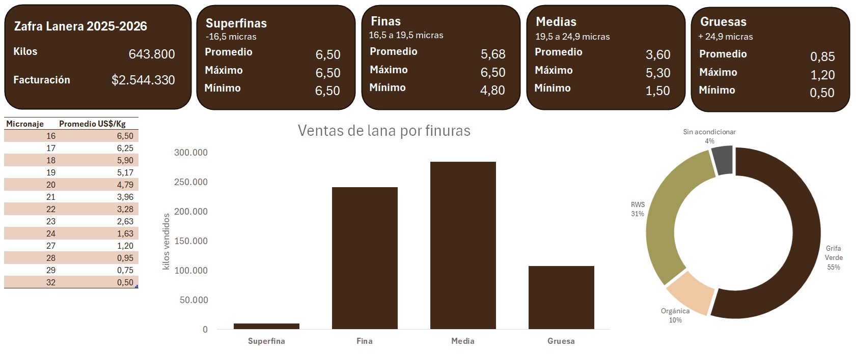 Durante los dos primeros meses de la presente zafra lanera 2025/2026, se ha informado un volumen de lanas comercializadas de 643.800 kilos en el mercado interno, lo que implica un aumento del 82% respecto a igual período de la zafra pasada, con una facturación de más de US$ 2,5 millones.