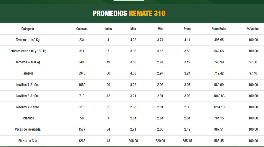 En tanto, los novillos de 1 a 2 año hicieron US$ 3,07 por kg en pie de promedio (US$ 961 al bulto), y los de 2 a 3 años US$ 3,03. La vaca de invernada, por su parte, hizo US$ 2,49 por kg en pie (US$ 968 al bulto), mientras que las piezas de cría se colocaron a US$ 585. La actividad del consorcio continúa este jueves con toda la escalera de vientres y cría.