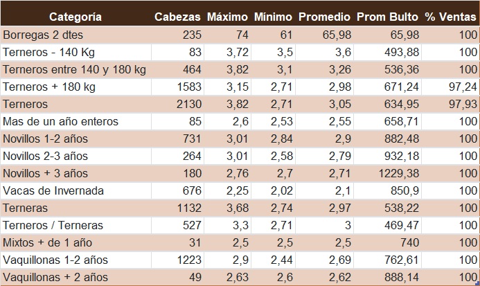 En el inicio de la operativa, los terneros marcaron la impronta de la demanda, con valores que promediaron US$ 3,05 al kilo, pero al bulto alcanzaron los US$ 634, donde la mayoría de la oferta se colocó sobre los US$ 500 por cabeza, y el lote de terneros más pesados cotizó en US$ 826,55.