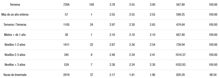 Los novillos de 1 a 2 años hicieron US$ 2,54 por kg de media (US$ 739 al bulto) y los de 2 a 3 años US$ 2,41 (US$ 1.014 al bulto). Por su parte, la las más de 2 mil vacas de invernada se vendieron en un 98,5% con un precio por kg promedio de US$ 1,96 y de US$ 820 al bulto. Este jueves el consorcio cierra su actividad con toda su escalera de vientres y terneras.