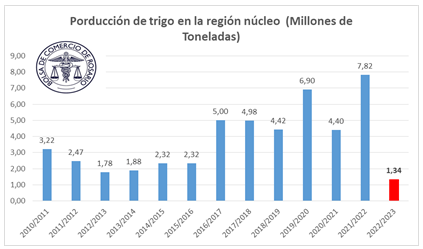 En la zona núcleo argentina el área triguera perdida trepa casi a 400 mil hectáreas, y se estima que el rinde caerá, en promedio, de 18 a 15 quintales/ha, informó la Bolsa de Valores de Rosario (BCR) en un informe. En la zafra pasada se produjeron 7,8 Mt, y para el 2023 se preveen 1,3 Mt, en una zafra en la que se espera que el fenómeno Niña esté presente hasta febrero, la probabilidad de que esto pase es del 55%.