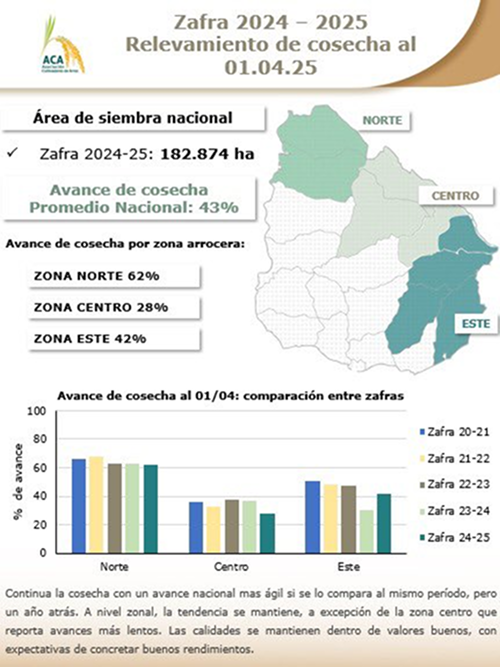La Asociación de Cultivadores de Arroz (ACA) divulgó su relevamiento de cosecha de la zafra arrocera 2024/25 al 1º de abril de 2025 con un avance a nivel nacional del 43%. Este progreso del área es superior a la zafra pasada, pero con importantes diferencias entre las distintas zonas de producción en el país.