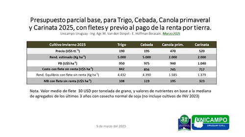 La consultora Unicampo realizó una presupuestación inicial para los cultivos de trigo, cebada, canola y carinata de la próxima zafra de invierno. Estos datos preliminares muestran una clara ecuación más favorable para los cultivos de canola y carinata, con márgenes brutos (sin renta) que duplican y triplican a las proyecciones para trigo y cebada. Las proyecciones de Unicampo se realizaron con fletes (US$/t 30, y valores de nutrientes de los últimos 3 años).