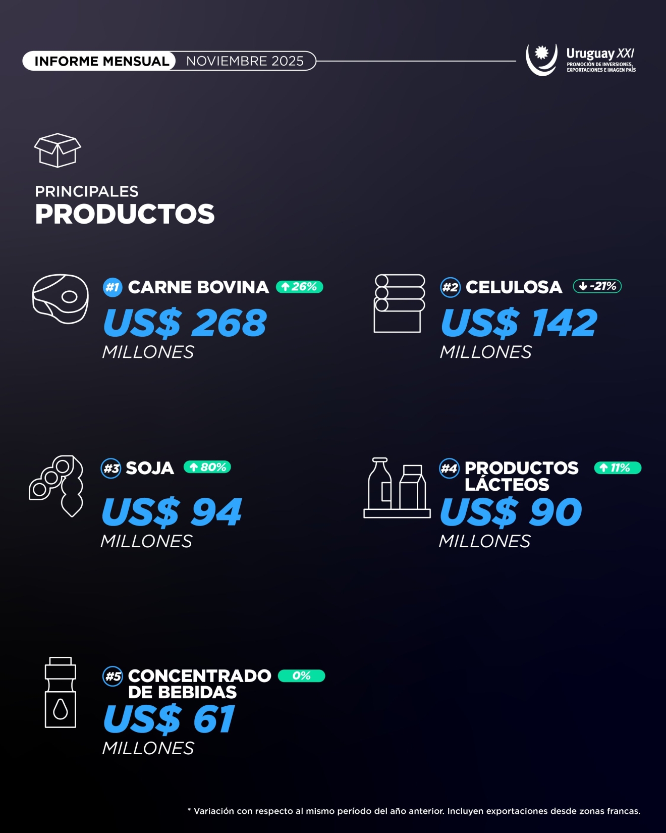 Estos incrementos permitieron compensar la caída interanual de productos como la celulosa, que se retrajo en noviembre. La carne bovina fue el principal producto exportado del mes con ventas por US$ 268. En segundo lugar, se ubicó la celulosa, con ventas por US$ 142 millones, lo que implicó una caída interanual de 21%.